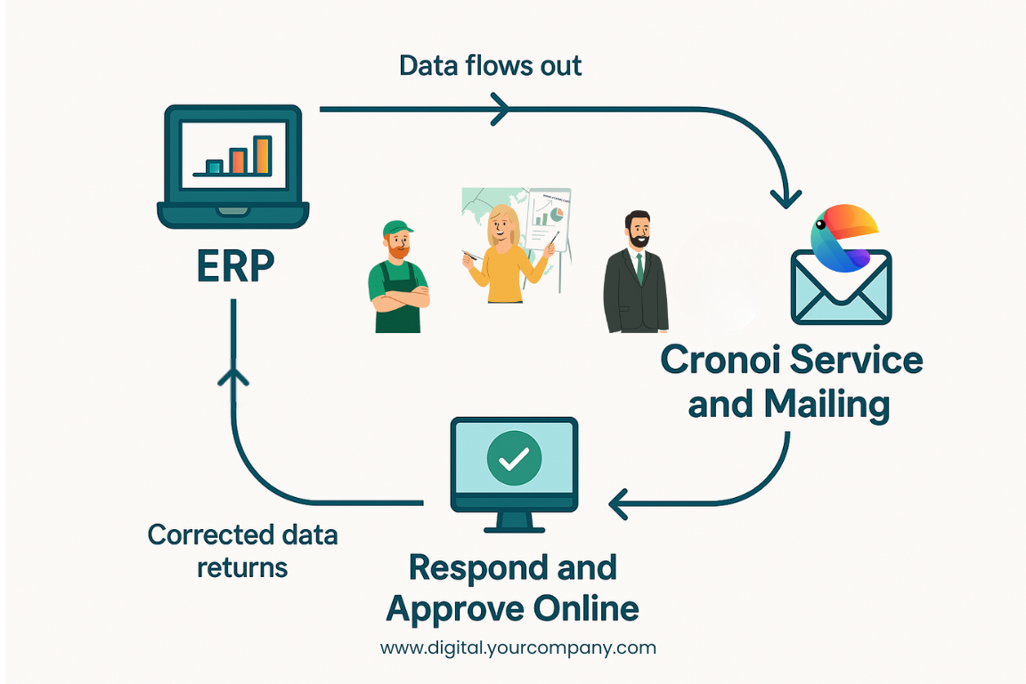 With Cronoi, you can effortlessly transform data from your ERP system into information requests, approval requests, or notifications and seamlessly integrate it.